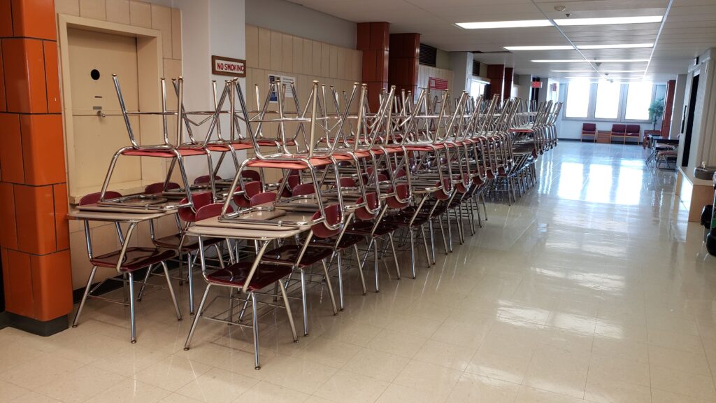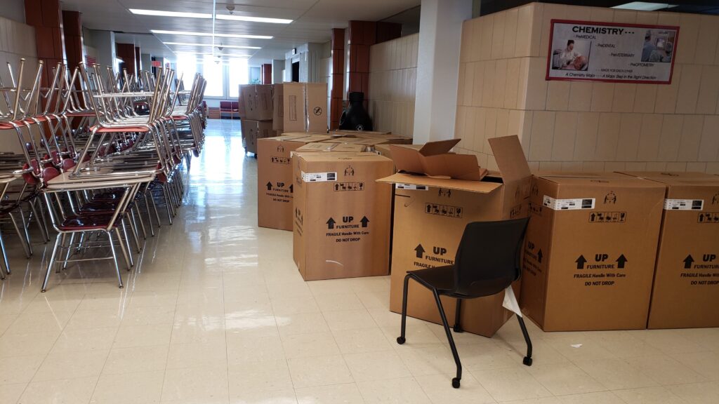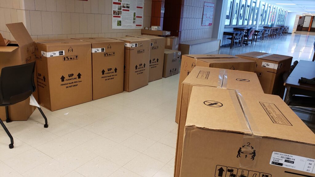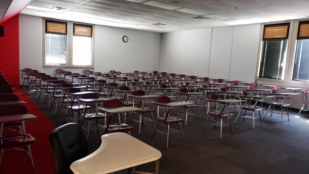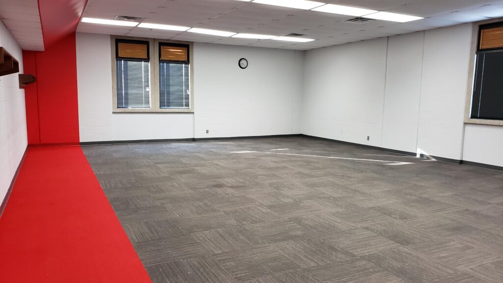 The front of the classroom used to have the instructor workstation, a projector screen, a stage, and a demo bench on the stage. All of these were removed to make room for the new tables, chairs, display monitors, and whiteboards. After the renovation, we moved all the existing furniture out to make room for the new furniture.
